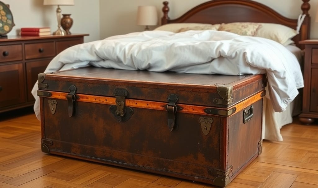 Charles brought Ellen’s steamer trunk to my bedroom, but I continued to avoid sorting through her clothing and other stored items. Another week passed before I was ready. Fragments of her life: old photographs, partially filled journals, trinkets. More of her memories. A green silk scarf triggered the time I shifted to a long, flowy green skirt, a poet shirt with full sleeves, shimmering thrift-store jewelry, and Grandma Helen’s paisley print scarf.