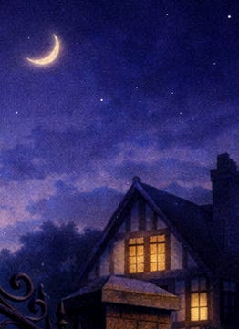 A half-moon casts its light through a dormer window. The mirror’s surface ripples like disturbed water. The attic behind me disappears, replaced by a small room I’ve never seen.