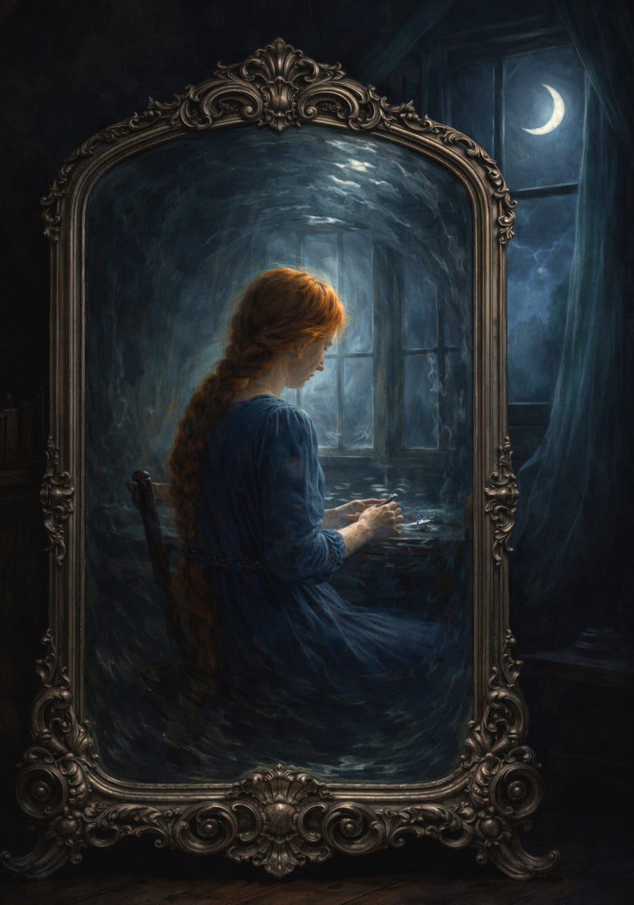 Some scenes refuse to stay where you put them. I wrote this one for “book two” (not yet published), but I think it belongs in this space between. It’s a moment from Stella’s thirteenth year, when mirror-sight had become something she realized was part of her. I hope you’ll enjoy this standalone piece about identity, belonging, and the coming-of-age experience.