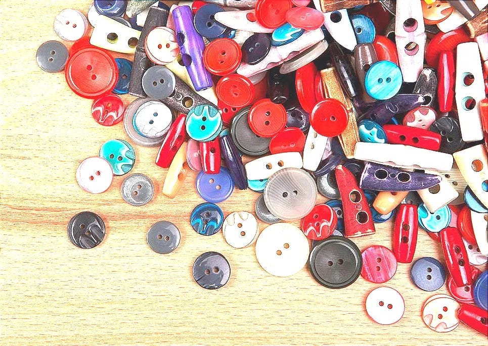A whiff of mid-century Bakelite, yellow and orange, from a tropical print cotton sundress. One, two, and four-holed buttons — tarnished brass, diamonds of glass.