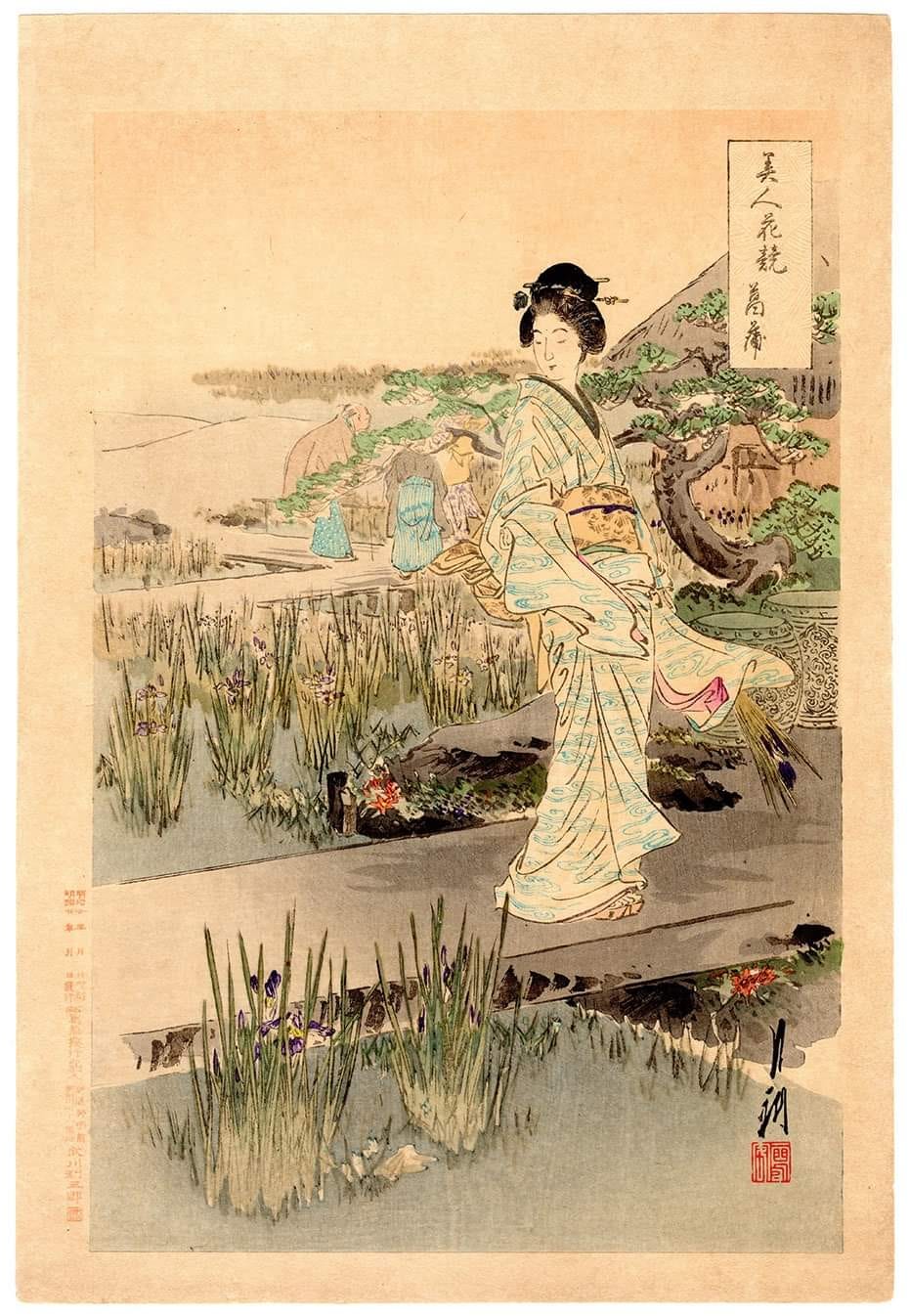 Ogata Gekkō (1859–1920) was working during the ‘opening to the West’ late Edo/Meiji bijin-ga, late 19th century. The traditional ukiyo-e style print, with the combination of a loose calligraphic signature, the red seal (hokka), the painterly and atmospheric print, and muted, watercolor-like pallette.“A Beauty with Irises” (likely from the series comparing women to seasonal flowers.) Bijin hana kurabe – shōbu - Japanese iris, associated with early summer.