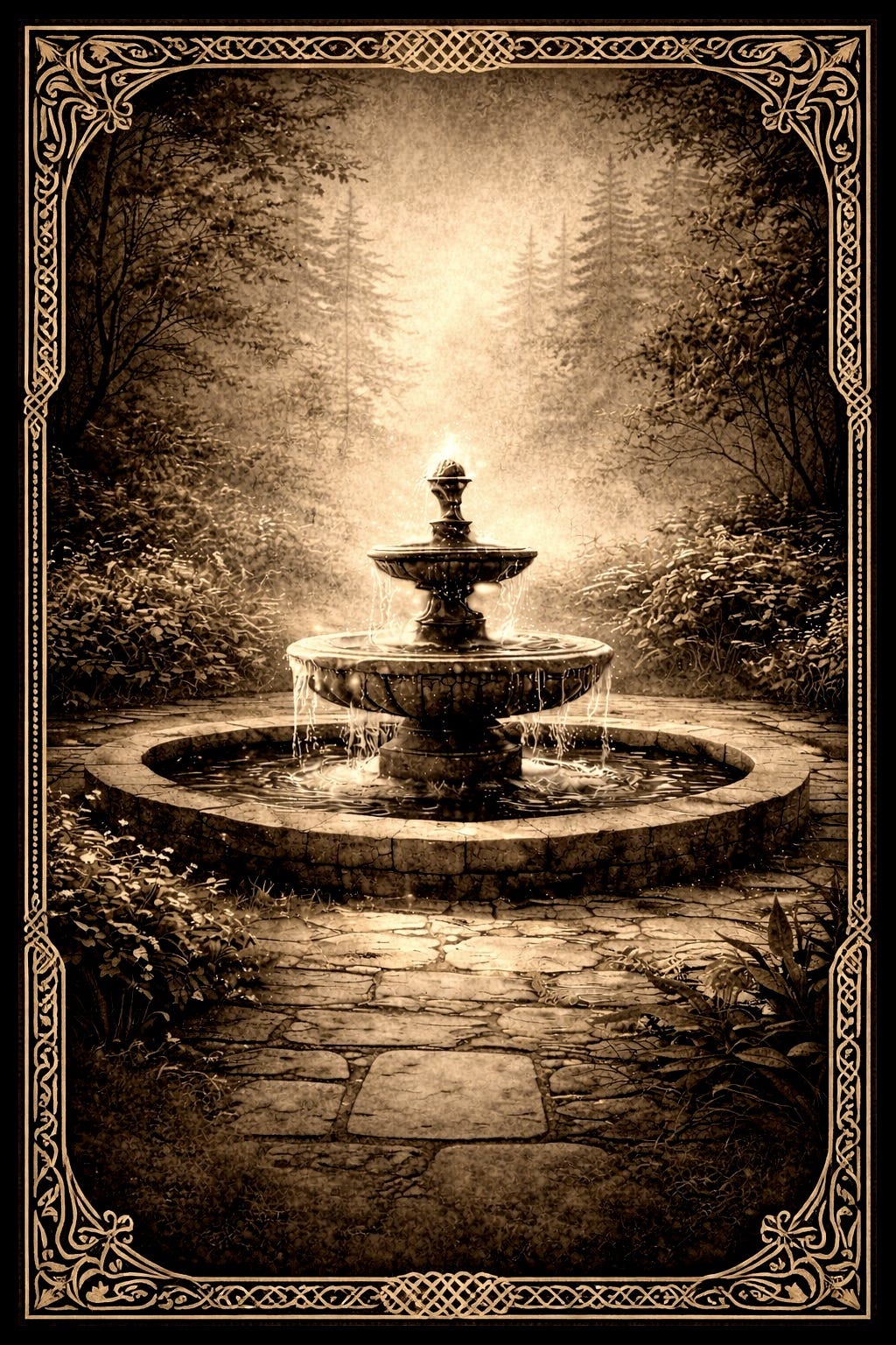 Music floated across the terrace: the ethereal sound of Celeste’s Celtic harp. She was a graduate student of musicology. Her draping satin green dress, as she perched on the wide edge of the Iron Fountain’s reflection pool, seemed to reflect the gleam of the slanting light. Strings chimed under her lithe fingers; their graceful bardic tones reverberated against the ancient iron.