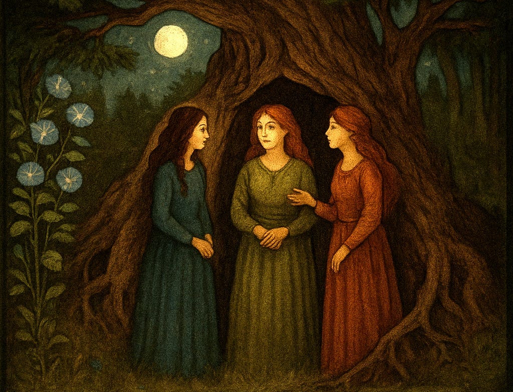 One sister was said to be a guardian of growing things. She understood the language of roots and branches. She knew that the trees bridge the earth and sky. As the legend goes, the second sister was a keeper of thresholds and transitions; veils between moments, between seasons, what was and what might be, and between day and night. The third sister was said to tend the blossoms that bloom between worlds; messengers between seen and unseen realms.