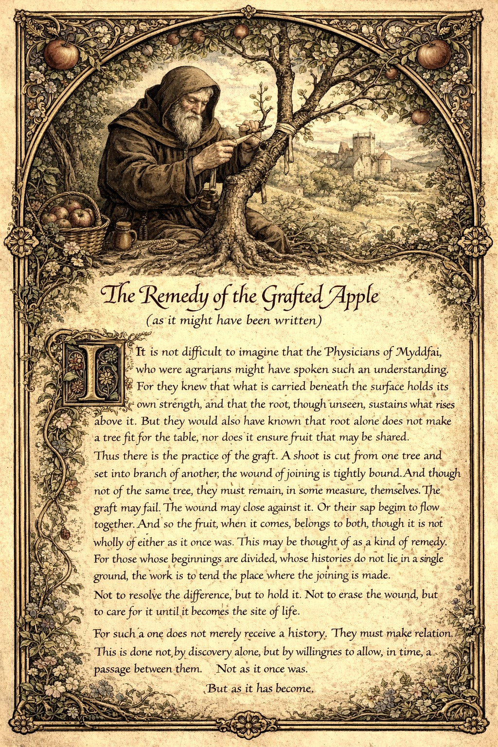 For an adoptee, the “empirical” is the life that can be seen and accounted for: their legal name, their adoptive family, their cultural environment. The “mythic intuition” reflects the more spectral connection to biological origins and ancestral inheritance; present, but not fully accessible. Just as the Myddfai physicians merged herbal knowledge with unseen understanding, the adoptee is asked to hold both lived experience and what precedes it, allowing something coherent to emerge over time.
